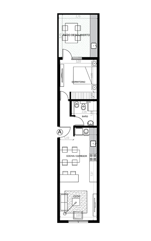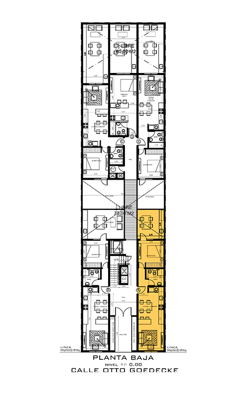 Los departamentos están distribuidos en dos bloques separados por un patio común, lo que garantiza una excelente iluminación natural en todas las unidades y fomenta una mayor privacidad entre ellas.